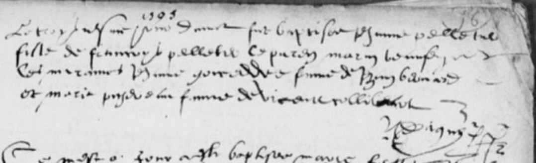 Le troysiesme jour du mois fut baptisée jehanne pelletier fille de francoys pelletier le paren marin [beausejour?] les maraines jehanne goicedde femme de jehan bernard et marie pichereau femme de vincent collibert