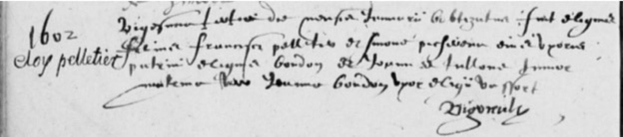1602 vigesima tertius die mensis januarii babtizatus fuit eligius filius francisci pelletier et simone pichereau eius uxoris patrini eligius boudon et joannus fullone [____] matrina vero joanna boudon uxor eligii vassort 1602 le vingt-troisième jour du mois de janvier fut baptisé Éloi fils de François Pelletier et Simone Pichereau sa femme parrains Éloi Boudon et [Maître?] Jean Fullone marraine Jeanne Boudon femme d’Éloi Vassort