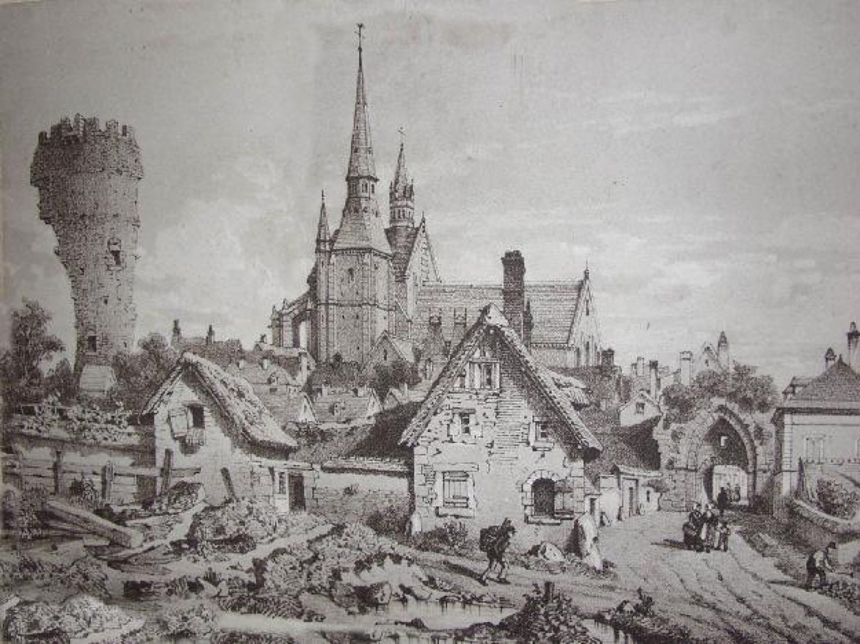 Ce tableau date de 1780. Au centre on voit l’église Saint-Pierre Saint-Paul. À gauche, les ruines du château-fort de Gallardon détruit pendant la Guerre de Cent Ans par le Dauphin, futur Charles VII, compagnon d’armes de Jeanne d’Arc. Après sa victoire sur les forces anglaises en juin 1421, Charles a fait miner le château, dans l’espoir que la guerre ne revienne plus jamais à Gallardon. Après le minage, un éclat d’une des tours de la forteresse tint debout. Le donjon, dit « l’Épaule de Gallardon » depuis le XVIIIe siècle, est toujours de nos jours tel qu'il est représenté sur ce tableau.