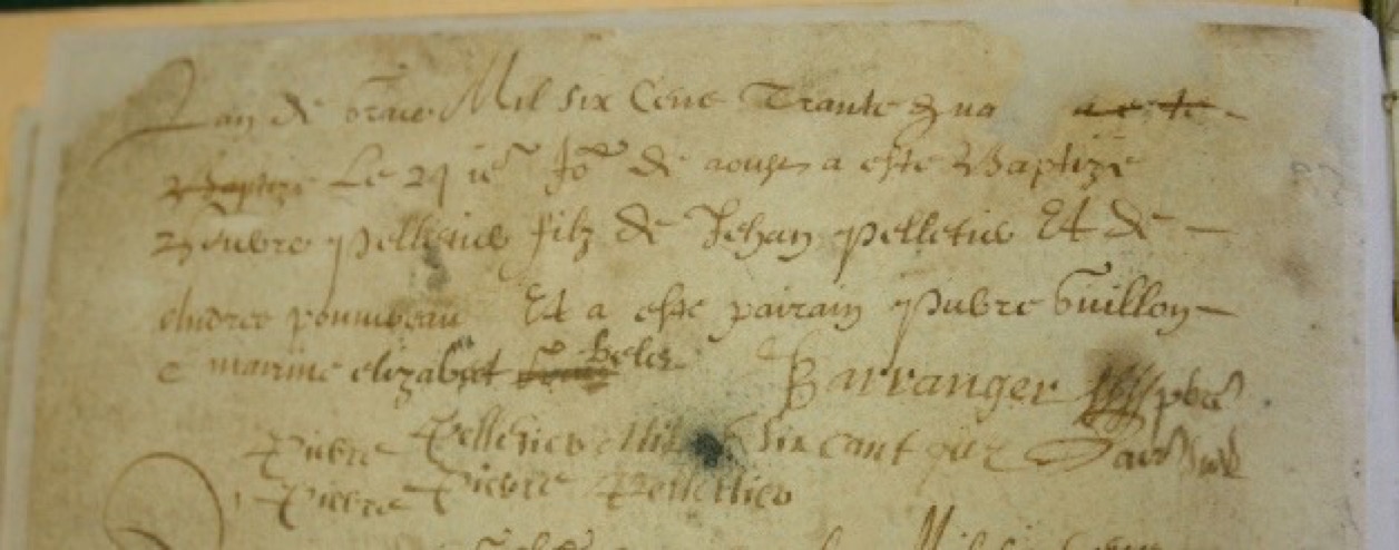 « L’an de grâce mil six cent trente quatre le 24e jour d’août à été baptisé Pierre Pelletier fils de Jehan Pelletier et de Andrée Pouvereau Et a été parrain Pierre Guillon et marraine Élizabeth Lalie. »