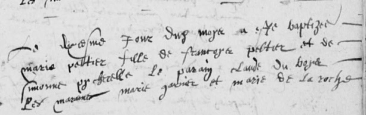 Le ii jour dud moys a este baptisse marie le peltier fille de francoys le peltier et simonne picheriau les parrains jehan martin et demoiselle katherine derouet et germaine peltier