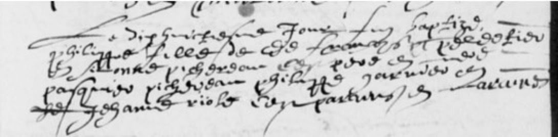 Le troysiesme jour du mois fut baptisée jehanne pelletier fille de francoys pelletier le paren marin [beausejour?] les maraines jehanne goicedde femme de jehan bernard et marie pichereau femme de vincent collibert