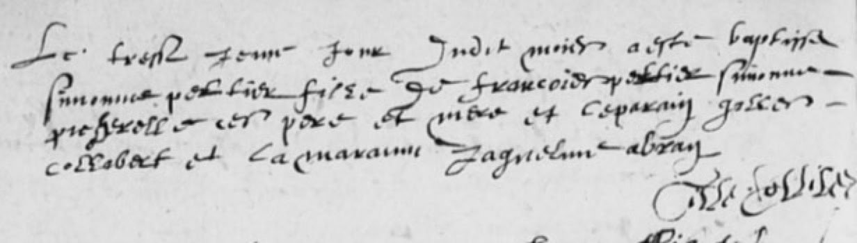 Le dixhuictiesme jour fut baptize philippe fille de de francoys pelletier et simonne pichereau ces pere et mere pasquier pichereau philippe garnier et je jehanne riole ces parains et maraines