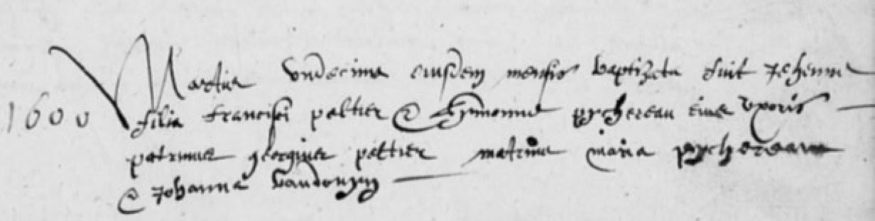 1600 Martis undecima easdem mensis baptizata fuit johanna filia francisci peltier et symonne pychereau eius uxoris patrinus georgius peltier matrinae maria pychereau et johanna baudouyn 1600 le mardi onzième du même mois fut baptisée Jeanne fille de François Pelletier et Simone Pichereau sa femme parrain Georges Pelletier marraines Marie Pichereau et Jeanne Beaudouin