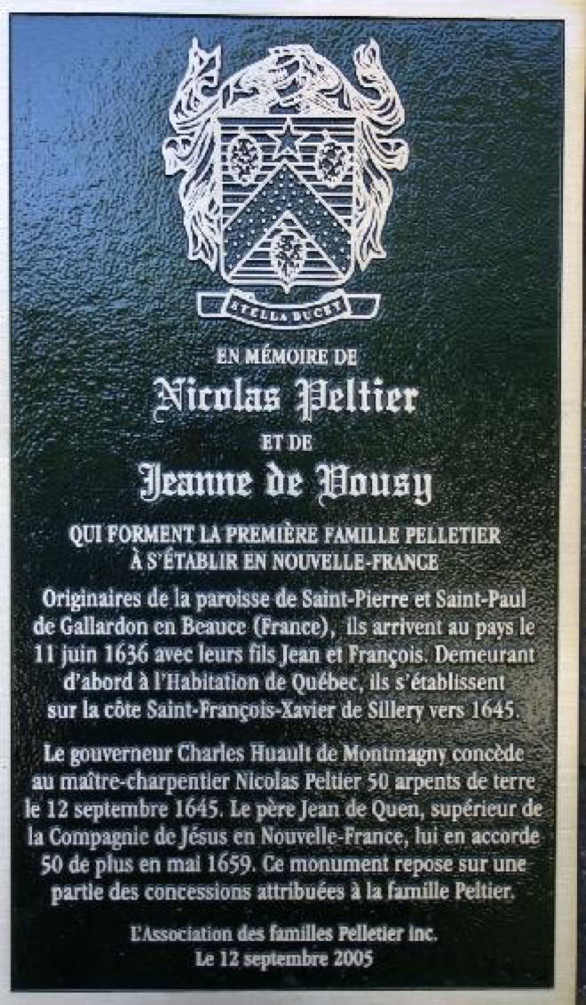 « Monsieur le Président du Conseil de l'Arrondissement de Sainte-Foy/Sillery; messieurs les membres du Conseil; Monsieur Dumas; Madame Blais-Gosselin; Mesdames et Messieurs les membres de l'Association des familles Pelletier; cousins; amis; invités : C'est une immense émotion qui remplit mon cœur en voyant ce monument qui honore ces hardis pionniers québécois, nos ancêtres Nicolas Peltier et Jeanne de Vousy. Au nom de leurs descendants dans le monde entier, je vous salue. Je vous remercie de tout mon cœur de cette célébration de la vie de nos aïeux. Grâce à ce monument, qui repose sur une partie des terres attribuées à cette famille il y a 360 ans aujourd’hui, tous ceux qui le verront, se rendront compte qu'ils se trouvent dans le berceau même de la famille Peltier en Amérique du Nord. Or malgré l'écart entre leur vie et la mienne, de quatre siècles et de onze générations, je suis toujours conscient de la vie extraordinaire de ce couple. Un jour de printemps comme il y en a tant, en l’an 1636, Nicolas et Jeanne ont entrepris un voyage empreint d'incertitude à travers un vaste océan, pour réaliser leurs ambitions dans le territoire hostile et implacable de la Nouvelle-France, où ils ont finalement réussi à établir leur famille. Entre 1633 et 1649, ils ont eu huit enfants; tous ont atteint l'age adulte. En 1681, leur progéniture comprenait trois fils, cinq filles, au-delà de soixante-dix petits-enfants, et même plusieurs arrière-petits-enfants; cinquante ans plus tard, c'était près d'un millier de descendants que l'on pouvait compter. La famille Peltier était donc à cette époque, la dixième plus grande famille souche québécoise [1] – ce qui n'est pas peu dire. Nicolas, lui, a vécu au-delà de 81 ans; ce qui est sans exagérer, plutôt extraordinaire pour l'époque. Sa lignée s'est perpétuée, et ses descendants continuent à prospérer, tant au Canada qu'aux États-Unis, ainsi que dans le monde entier.