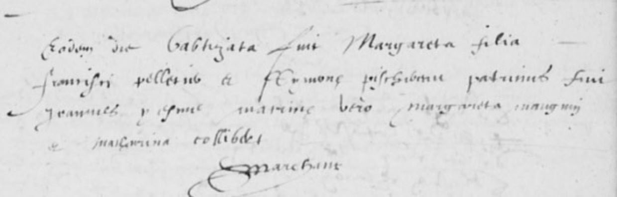 Le même jour fut baptisée Marguerite fille de François Pelletier et Simone Pichereau fut parrain Jean Yesme marraines Marguerite Mauguin et Mathurine Colibert [signé] MARCHANT