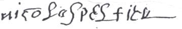 1596 le quatrième jour du mois de juin fut baptisé Nicolas fils de François Pelletier et de Simone Pichereau sa femme; les parrains Nicolas Brebier et Éloi Pelletier la marraine Mathurine Moinaut femme de Pasquier Pichereau