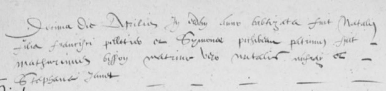 Le dixième jour d’avril de la même année fut baptisée Nathalie fille de François Pelletier et Simone Pichereau fut parrain Mathurin Bisson marraines Nathalie Naufray et Étiennette Janet