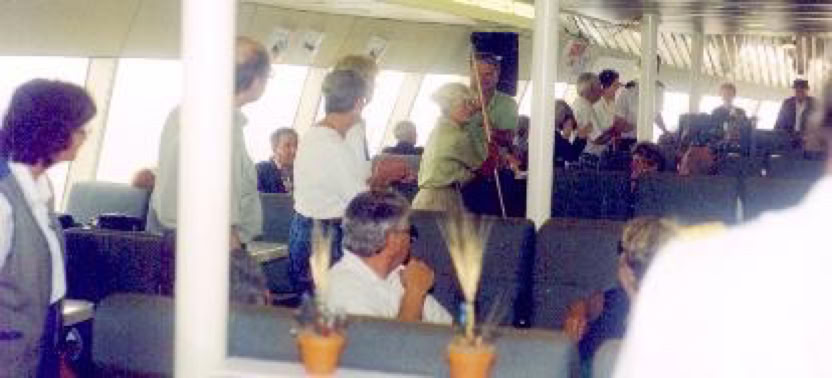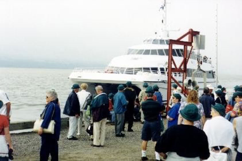 Saturday morning, all of the Pelletiers got up at the sound of their alarm clocks and got together for the 6:45 AM breakfast. Afterwards, the buses showed up and took everybody to the quay. Lets not forget the President of the association who started singing and everybody joining their voices together. It was a good beginning for the coming day. Aboard the catamaran "Famille Dufour 2 ", the Pelletiers were easy to spot because they all received a hat with the family name sewn on it. They all quite enjoyed discovering the north coast landscape that virtually remained the same since Jacques Cartier. Leaning on the guardrail, and looking thru their binoculars, people were deeply captivated by the beautiful view.