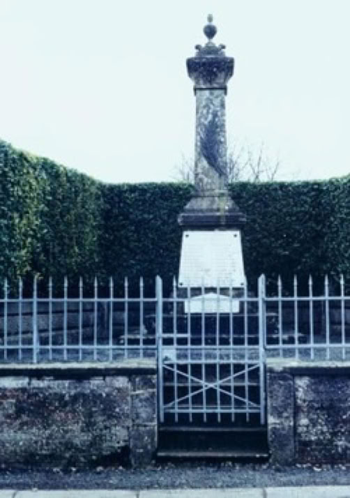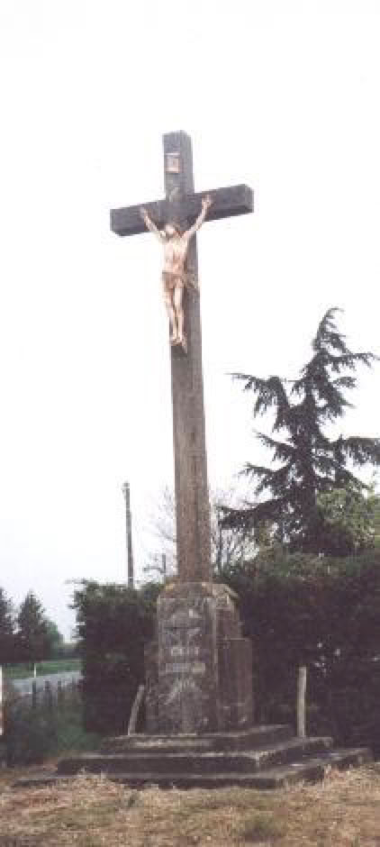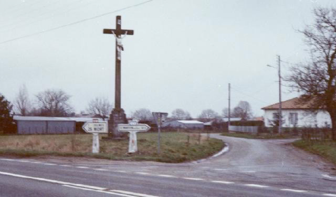 Le calvaire de l'entrée Est avec de vieux hangars en arrière-plan. (1982)