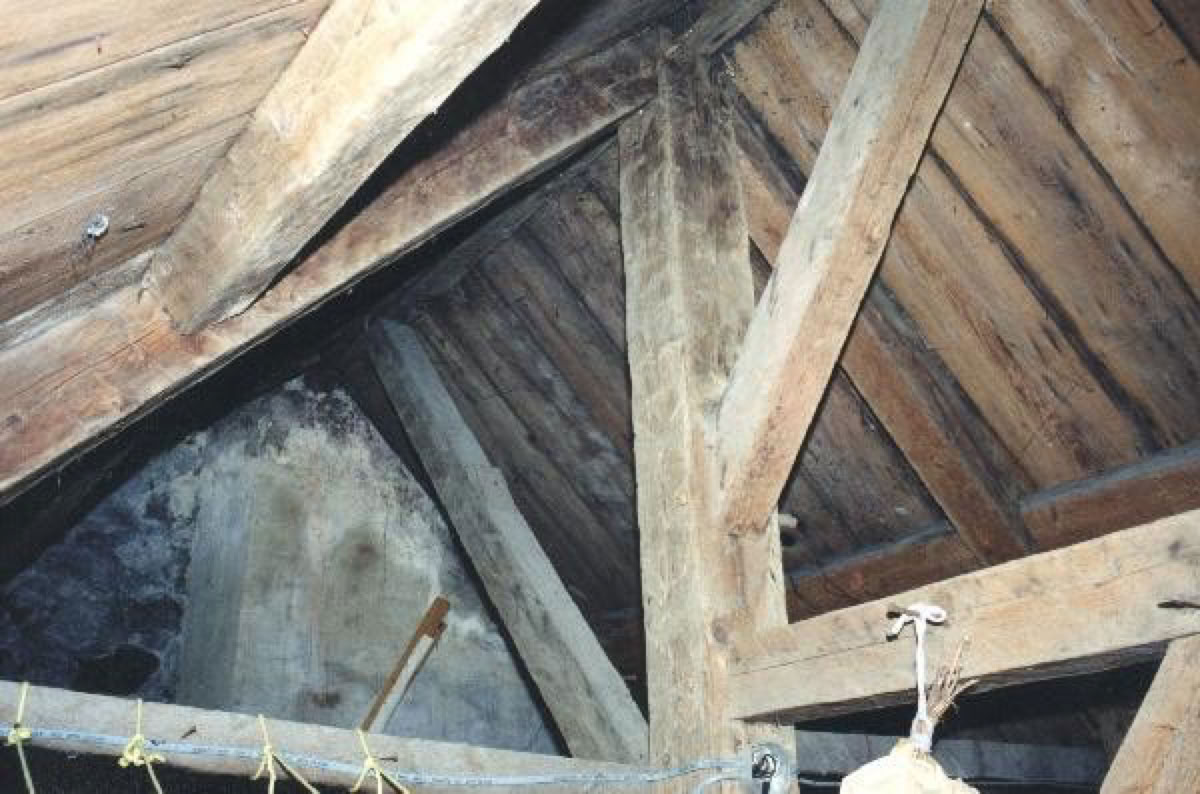 C’est en montant au grenier que l’on découvre ces poutres d’origine qui forment la charpente de la maison. Ces poutres équarries par les constructeurs Pelletier portent encore les traces des coups de haches. Fait remarquable, ces poutres sont reliées grâce à des chevilles en bois. Puis, c’est aussi à cet endroit que l’on peut voir les pierres qui soutiennent les murs de la maison, nous sommes revenus en 1774 le temps d’un moment.